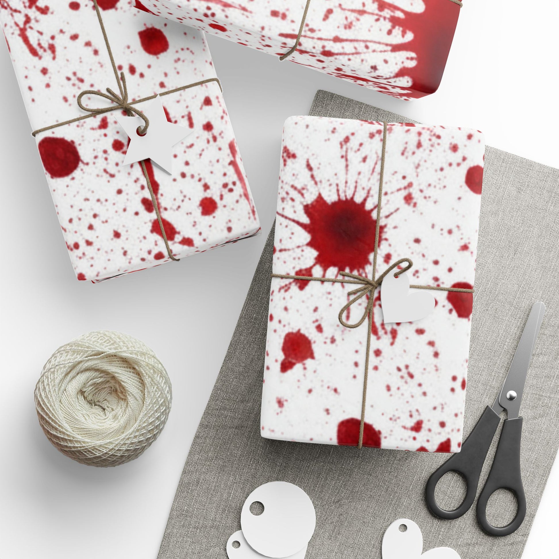 This bold wrapping paper brings a striking, artful edge to gift-giving. Crisp white stock is splattered with deep crimson bursts and scattered flecks, creating a dynamic, hand-thrown paint effect that reads modern and slightly dramatic. The design wraps narrow packages beautifully or adds a statement panel across larger boxes. It feels playful and a little daring—great for people who love unconventional holiday styling, horror-themed fun, or artsy, gallery-inspired presentation. Each roll prints one-sided in high-definition on sturdy 90 gsm fine art paper, with your choice of a smooth matte or luminous glossy finish. Note: rolls include white trim at the edges with a small bar and QR code from the printer.