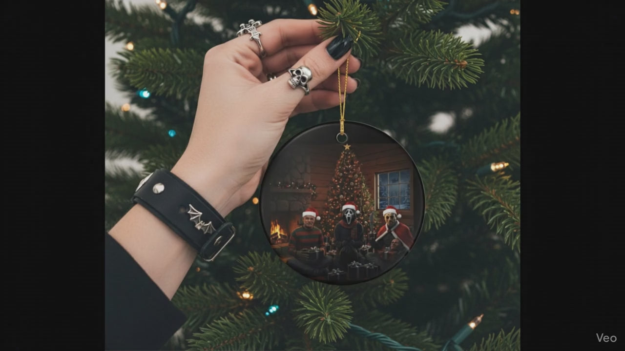 A glossy ceramic ornament that brings dark humor to holiday décor. The round white ceramic disc features a matte-printed scene of three masked horror figures wearing Santa hats, gathered around a warmly lit Christmas tree and fireplace. Hung by a golden string, it balances subtle sheen with a muted print finish for a striking, slightly eerie centerpiece on any tree or display. Each piece is single-sided, durable, and ready to hang straight from the box.