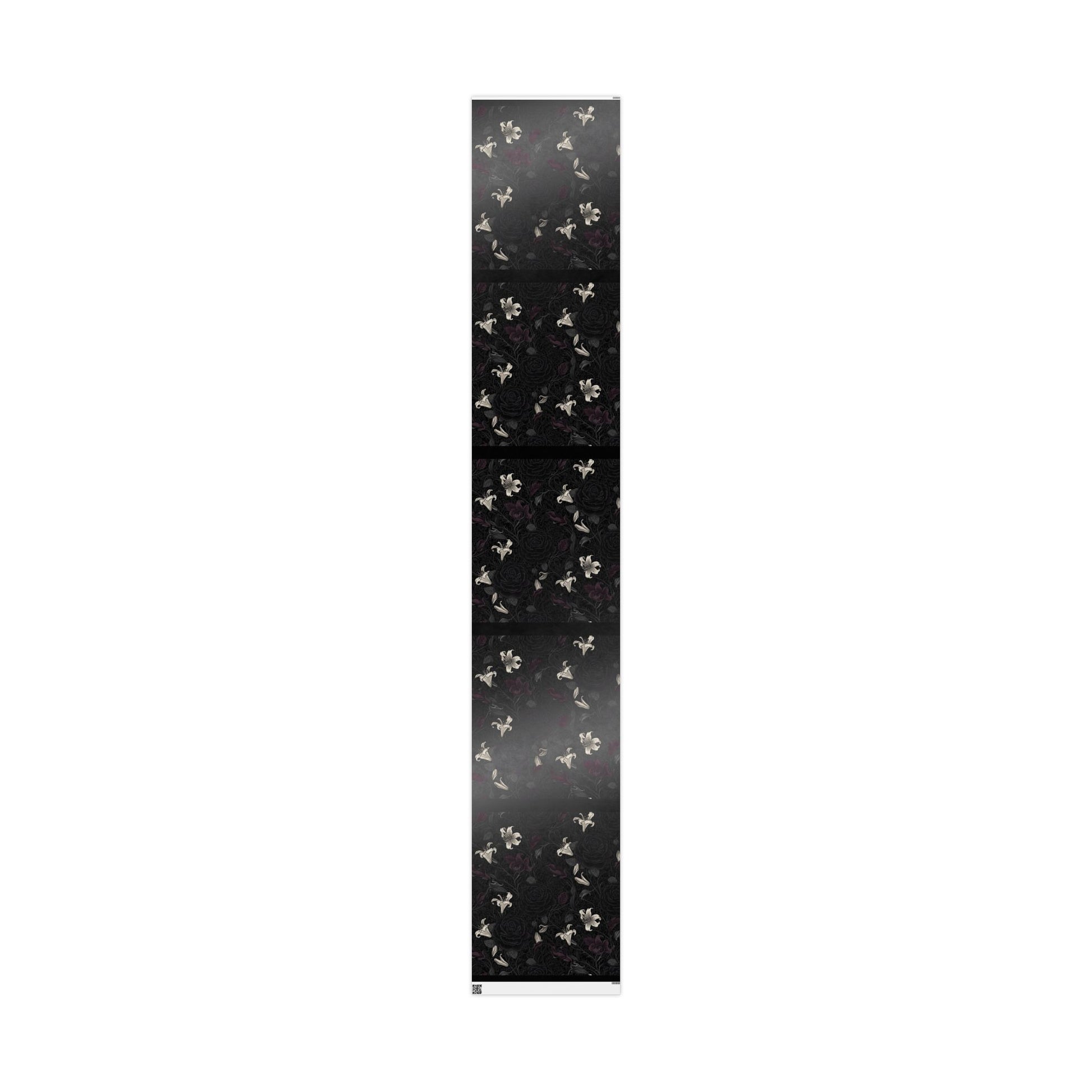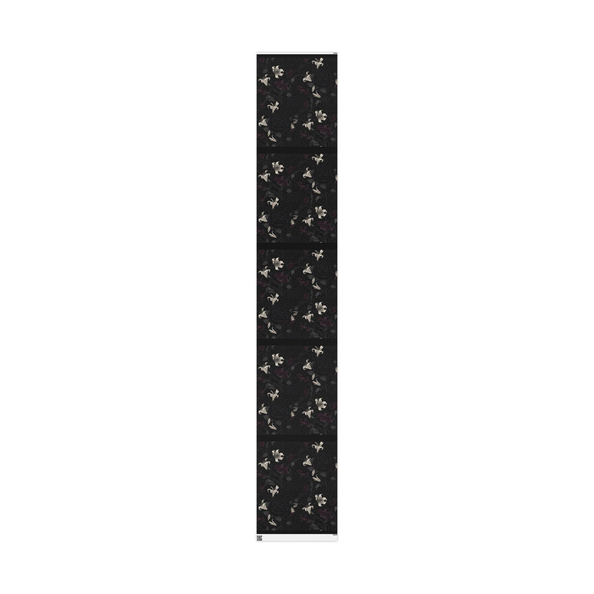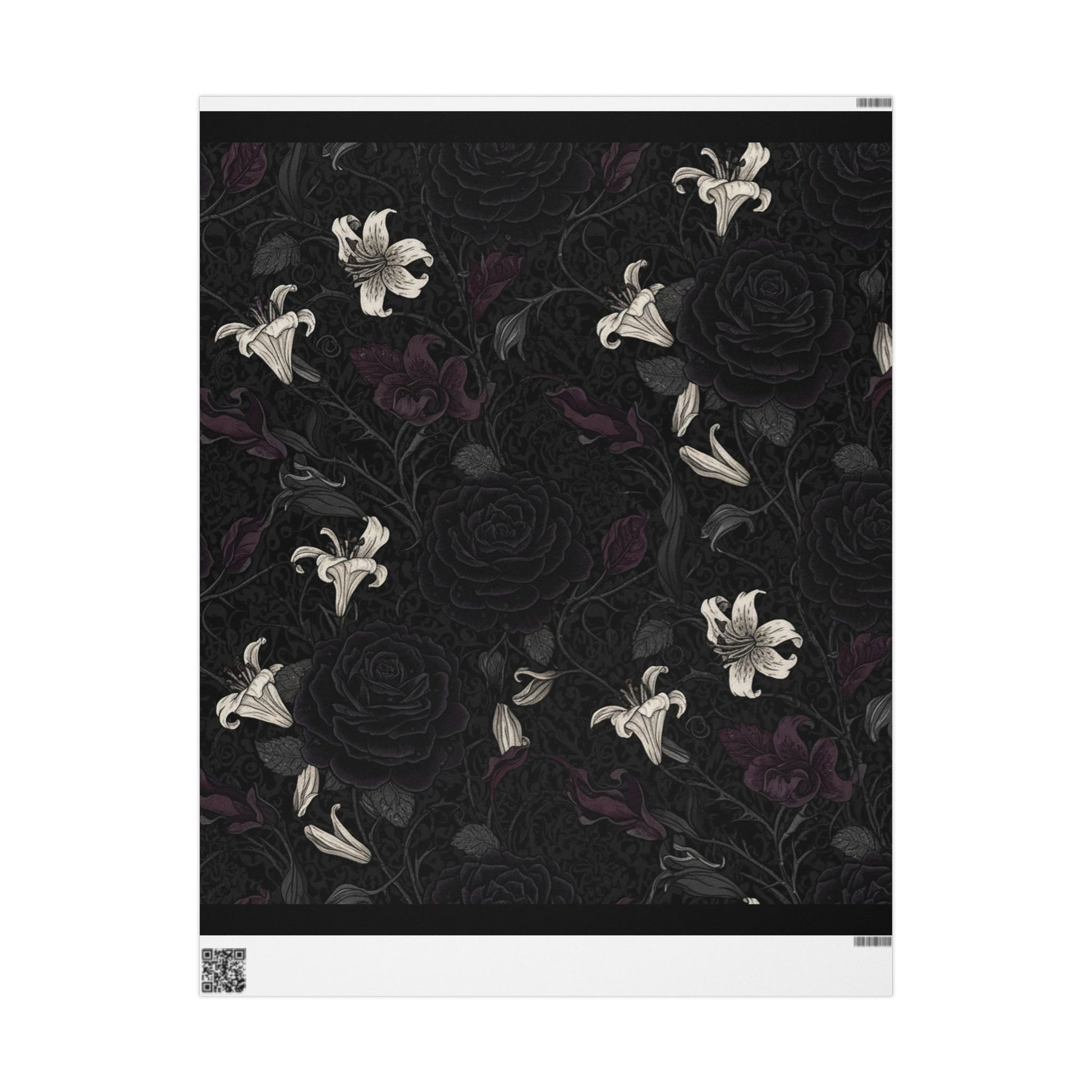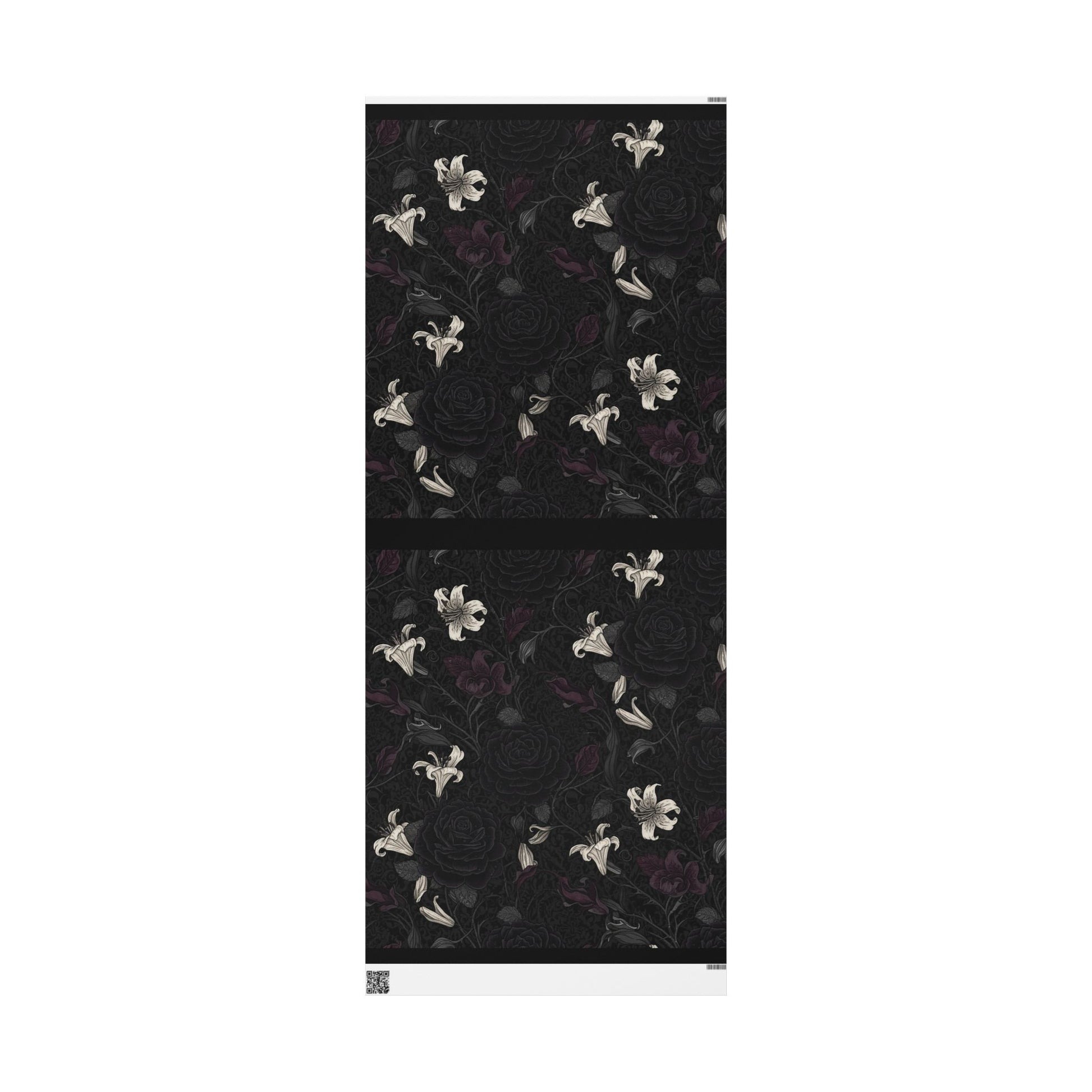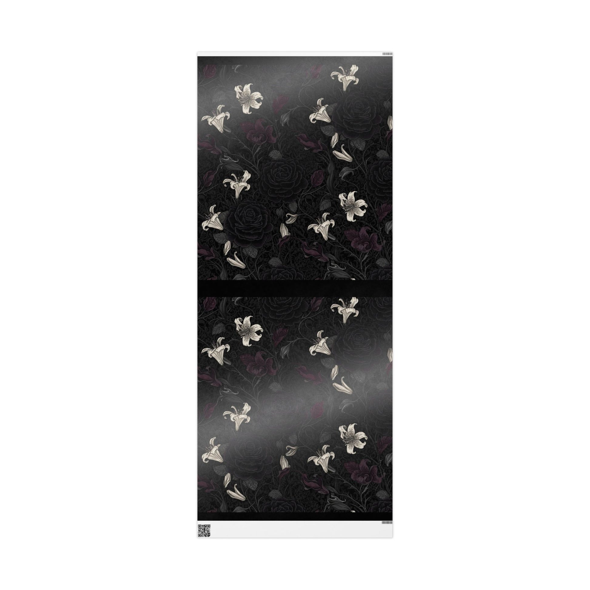 A roll of elegant black wrapping paper patterned with soft, painterly florals in muted whites and greys. The deep matte or glossy background gives each bloom room to breathe, creating a quiet, sophisticated look that complements thoughtful presentations. Lightweight yet substantial, the 90gsm fine art paper smooths and folds cleanly for crisp edges, making bows and ribbons sit neatly. Small white trim with a barcode and QR code appears at the roll edges — a subtle reminder this is premium, made-to-order paper. Use it to add a hush of refined style to birthday surprises, intimate anniversaries, or cozy holiday exchanges.