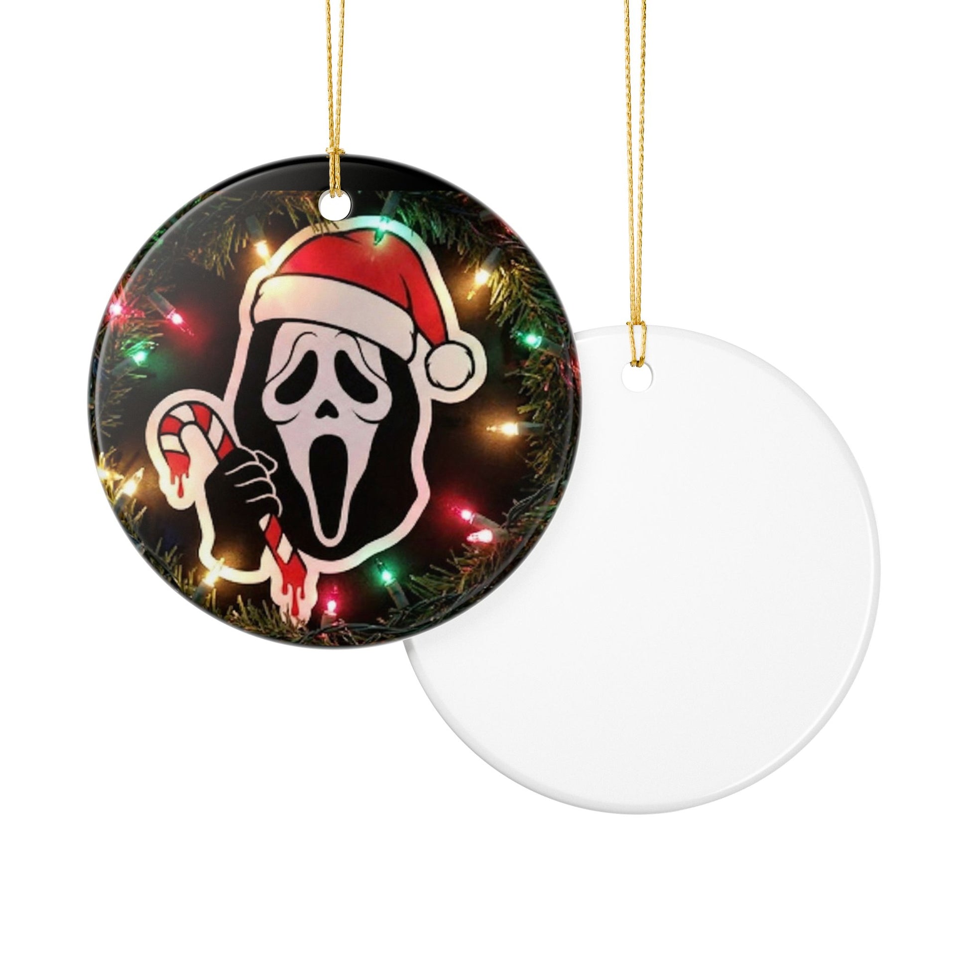 A round ceramic ornament that brings playful, spooky cheer to holiday décor. The front shows a dark, glossy scene of twinkling Christmas lights framing a cheeky ghost-face wearing a Santa hat and holding a candy cane—just a touch of horror-humor for the tree. Lightweight but sturdy white ceramic gives it a smooth, glossy face with a matte print so the artwork reads clearly without glare. A slim gold string is included for easy hanging on branches, hooks, or wall pegs. Use it to add an offbeat accent to a themed tree, a horror-movie marathon night, or a quirky stocking display.
