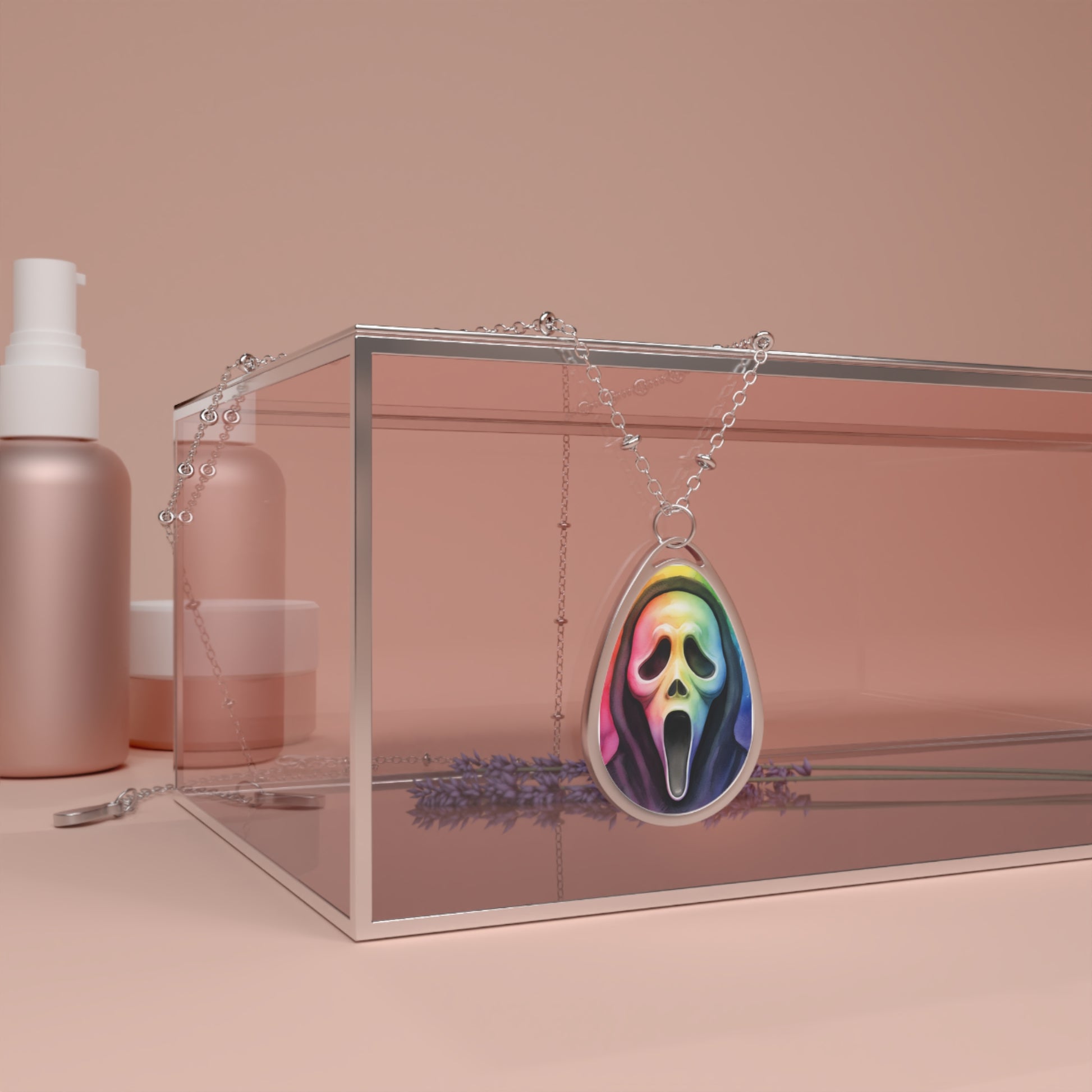 This glossy ellipse pendant carries a bold, artistic mood — think neon-soaked nights and tongue-in-cheek spookiness. The vibrant, full-color print sits on a white aluminum surface and is sealed with a glassy finish that makes the rainbow-hued scream motif pop against the polished metal setting. Lightweight zinc-alloy hardware and a secure lobster-clasp chain let you wear it all day, whether layered with other pieces or standing alone as a statement. It slips easily into casual streetwear or night-out looks, adding a playful, slightly eerie edge to the wearer’s style.