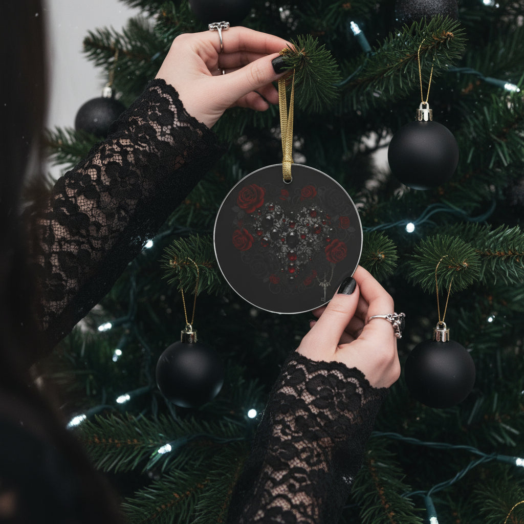 A delicate clear acrylic ornament that brings a moody, romantic touch to holiday décor and year-round displays. The glossy, full-color print captures deep reds and soft blacks with crisp detail, creating a subtle heart-and-rose motif that feels both intimate and artful. Lightweight and shatter-resistant, it hangs from a gleaming gold ribbon included with every piece. Tuck one into a stocking, string several across a mantel, or add to an altar or memory tree to reflect quiet moments and personal style.