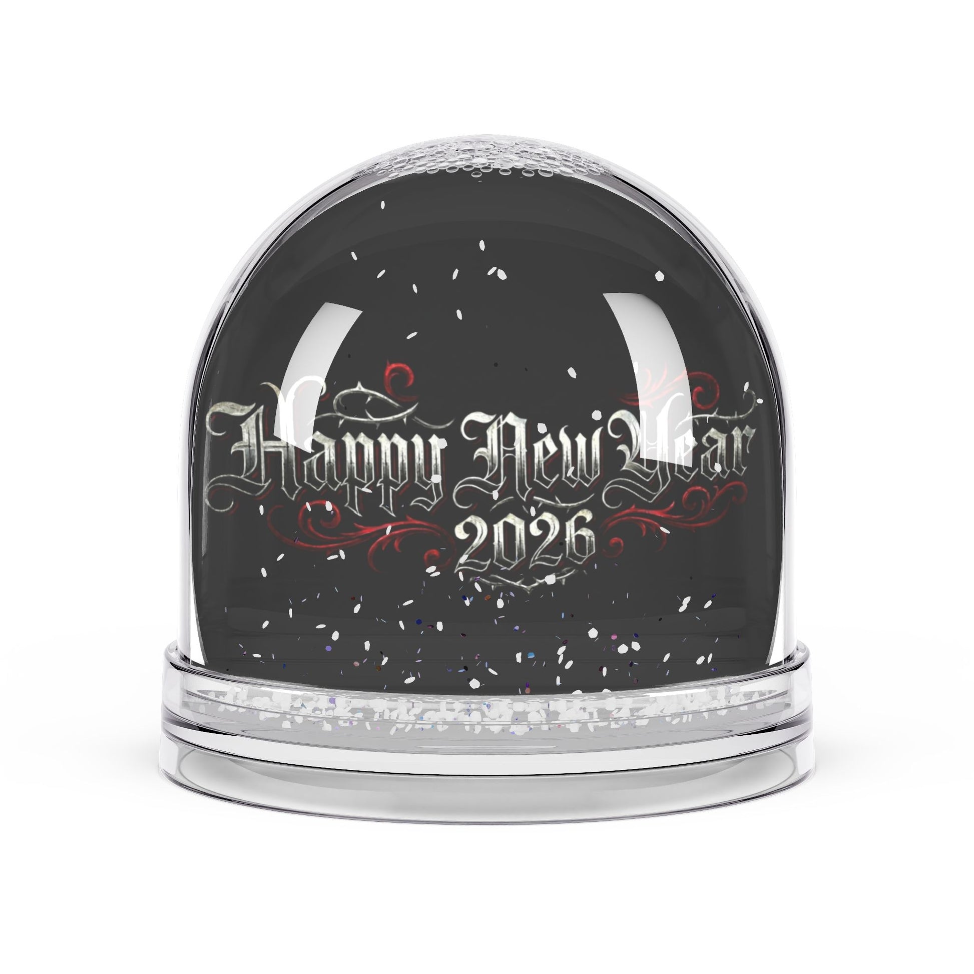 This snow globe captures the hush of a midnight celebration — tiny white flakes drifting around a double-sided acrylic frame that reads “Happy New Year 2026” in ornate lettering. The clear polystyrene dome and base keep the scene lightweight and durable, while acrylic glitter and PET snow swirl in purified water whenever you give it a gentle shake. It feels like holding a quiet countdown in your hands: reflective, slightly nostalgic, and ready to sit on a shelf, desk, or mantel as a keepsake from the turning year.