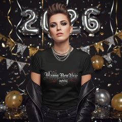 This lightweight crewneck shirt carries a bold New Year energy — dark, slightly gothic lettering reads “Happy New Year 2028” across the chest with subtle red filigree accents. The matte black fabric makes the design pop while keeping the overall look understated and a little moody. It slips on easily for late-night gatherings, small concerts, or midnight countdowns and becomes a comfortable staple you’ll reach for when you want a mix of low-key and statement-ready. The feel is smooth and breathable; the collar holds its shape, and the tear-away label keeps the neck comfortable after repeated wears. Wear it with worn denim and boots or layer under a leather jacket when the night calls for a little edge.