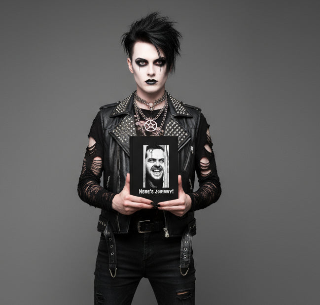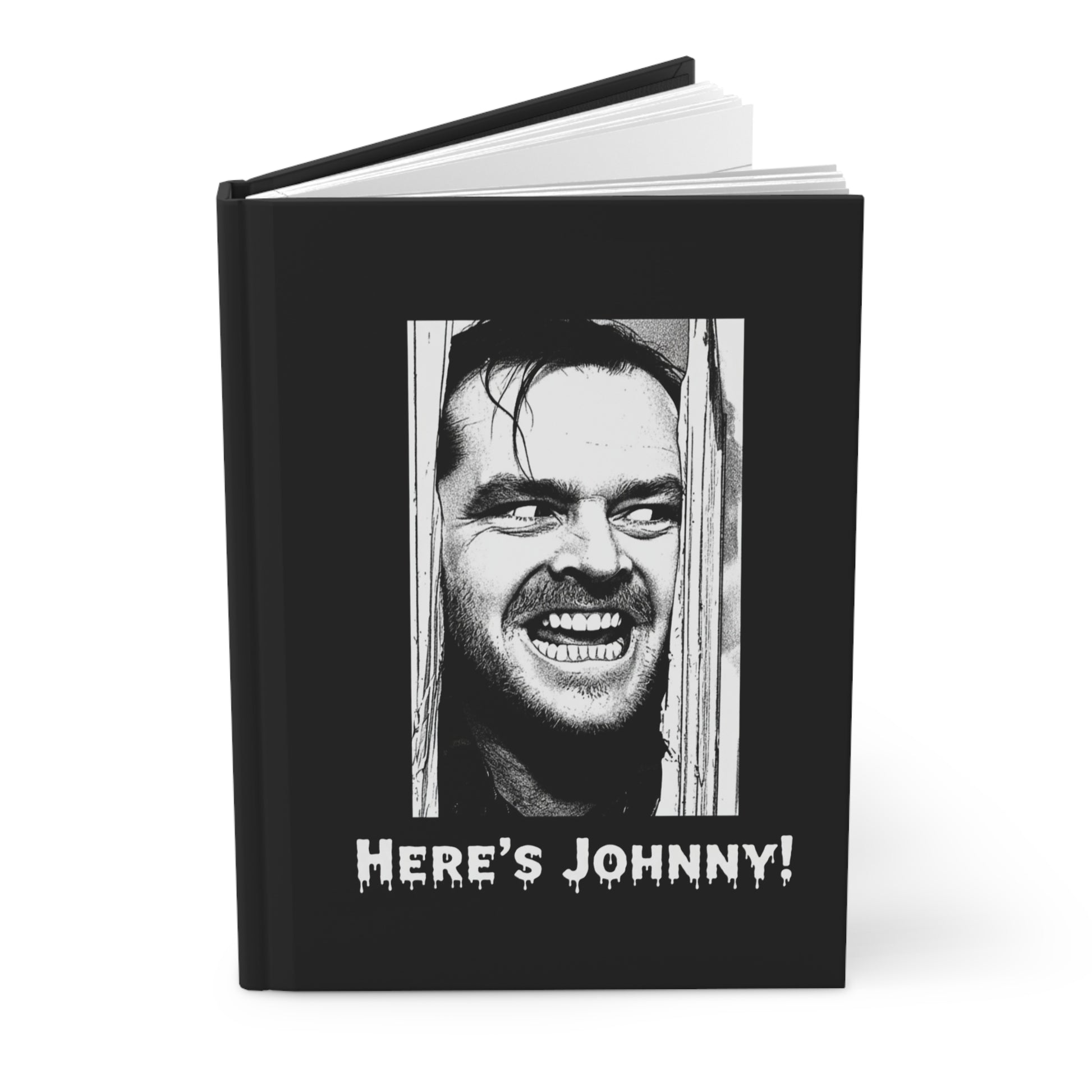 This matte hardcover journal carries a chilling, cinematic energy—dark black cover, stark white photo of a grinning face framed in a doorway, and the bold caption “Here’s Johnny!” below. It’s made to sit on bedside tables, bookshelves, or next to a flickering lamp and invite late-night scribbles, screenplay notes, or horror-fan journaling. The sewn casewrap binding keeps the book flexible while the full-wrap print and matte lamination give the cover a smooth, long-lasting finish. Perforated lined pages let you remove sketches or notes cleanly. Keep it on hand for writing prompts, scene ideas, or as a little thrill when you open it to write.
