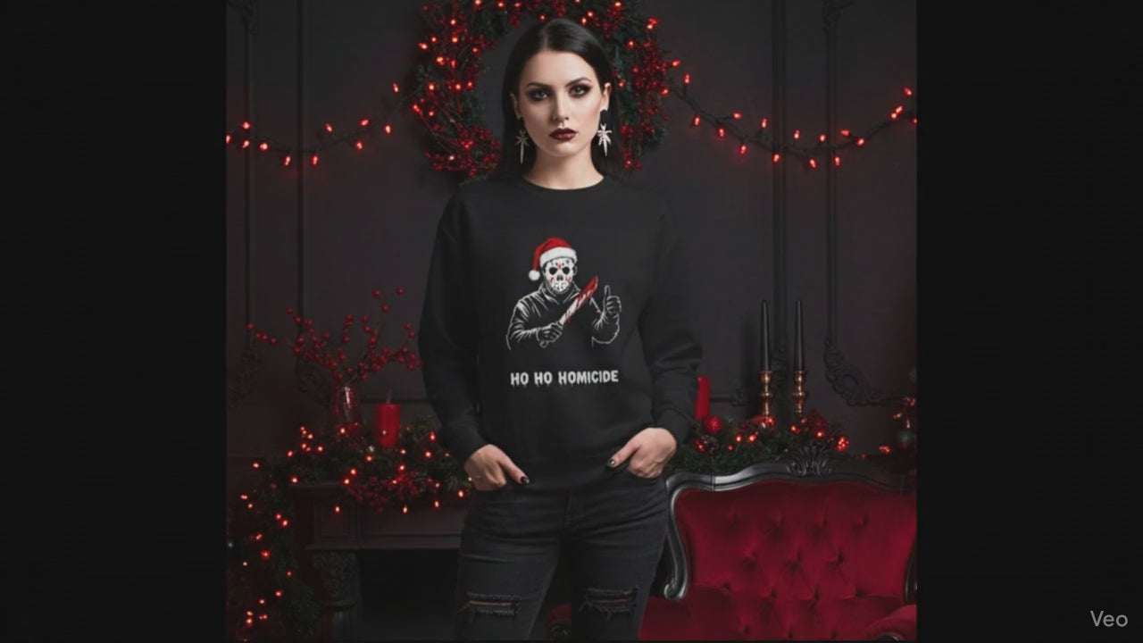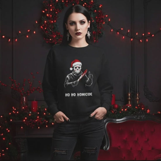 This crewneck sweatshirt settles into the darker side of holiday humor. A cracked skull in a Santa hat holds a blood-streaked knife, while the phrase “HO HO HOMICIDE” sits beneath—equal parts macabre and tongue-in-cheek. The medium-heavy 50/50 cotton-poly fabric drapes with a classic, roomy fit and a clean crew neckline. Subtle details—double-needle stitching at stress points, ribbed collar and cuffs, and a tear-away label—keep it comfortable and built to last. Wear it to late-night movie marathons, irreverent holiday parties, or when you want your seasonal look to lean sarcastic and bold. The design is printed with DTG for crisp artwork, and options for embroidery are available on the chest and wrists if you prefer a stitched accent.