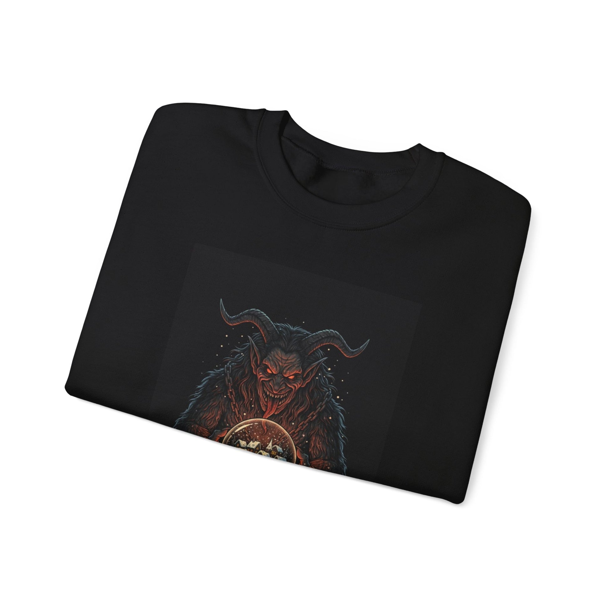 Slip into a sweatshirt that tells a story. This crewneck carries a dark-humored holiday scene — a hulking horned figure cradling a glowing bowl of mischievous cookies with the caption "Naughty or Nice." The image sits on a deep black backdrop so the moody reds and warm highlights sing, whether you’re out for a late-night walk, curled up with a mug, or leading the weirdest holiday party in the room. It’s heavyweight comfort with a slightly oversized classic cut that drapes easily over layers. Thoughtful details like a ribbed collar that keeps its shape, durable double-needle stitching, and a soft tear-away label make it one you reach for again and again. Ethically sourced cotton and eco-conscious dyes mean it looks good and sits easier on your conscience.