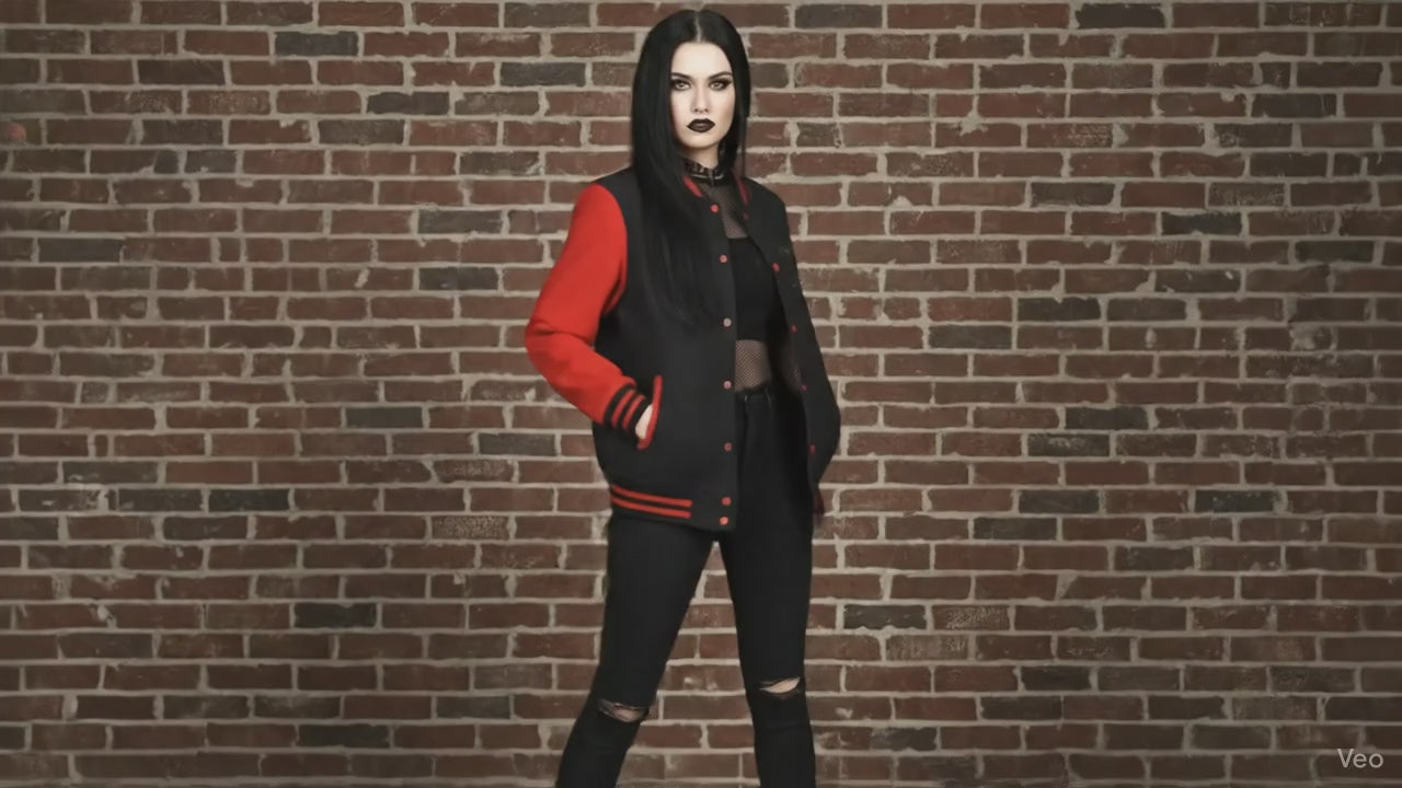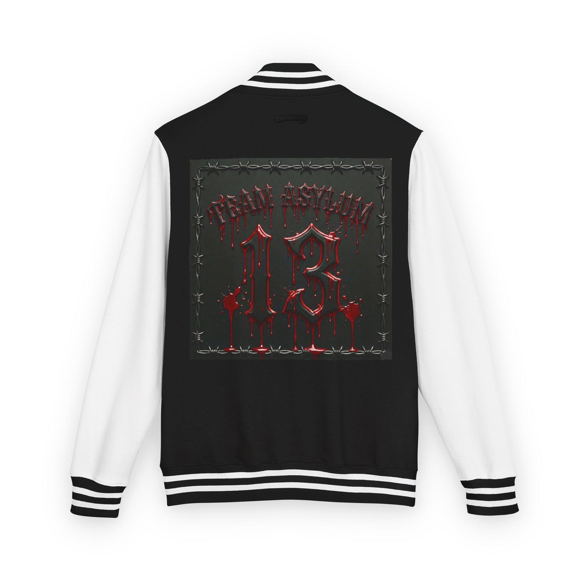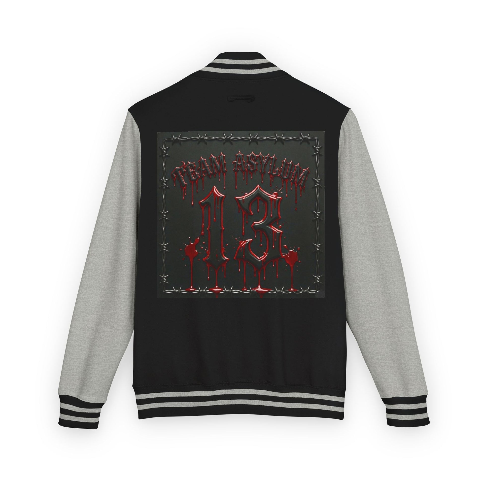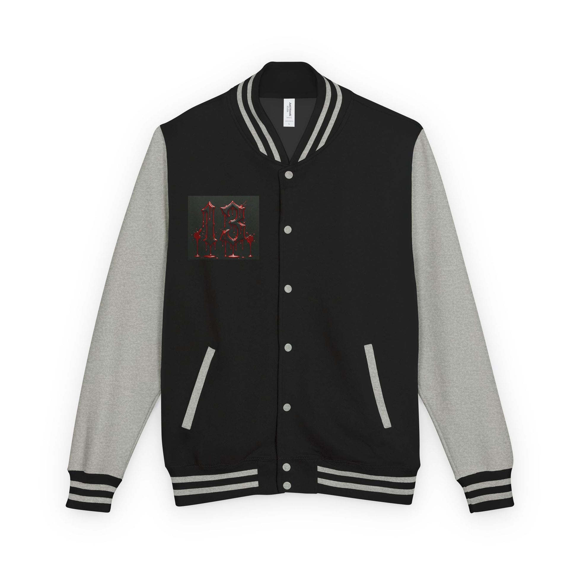 This heavyweight letterman jacket brings the edge of streetwear into a classic varsity silhouette. Thick, garment-dyed fabric drapes with a lived-in softness while the bold back panel lays out a dark, metallic-number design that reads like an emblem from underground music flyers. Crisp white sleeves and striped ribbing give contrast and structure, while the sewn-in label and sturdy snaps hold up to daily wear. Wear it to shows, late-night rides, or when you want a piece that feels part nostalgia, part rebellion — it fits into a lineup of layered looks and adds attitude without shouting.