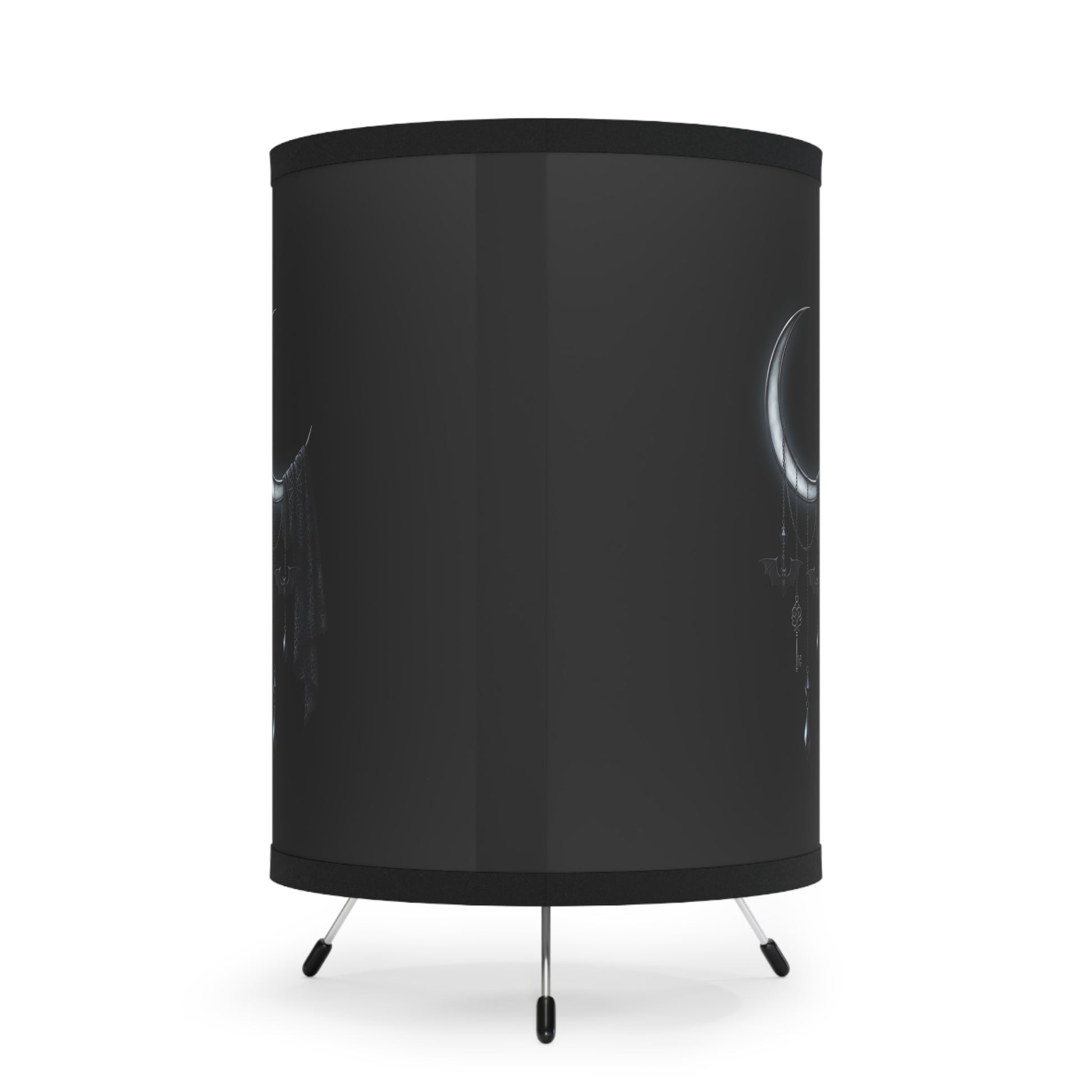 A moody tripod lamp that brings quiet, contemplative light to bedrooms and reading nooks. The high-resolution polyester shade features a soft, crescent-moon motif with dangling charms rendered in deep charcoal and silver tones. When lit the fabric trim diffuses a warm, intimate glow that highlights the subtle details and gives the piece an almost-lunar presence. The slim galvanized steel tripod base keeps the silhouette minimal and modern, while the 360° print wraps the shade so the artwork reads from any angle. It’s a lamp to settle beside at the end of a long day — for slow reading, sketching, or simply holding a small, private moment of calm.