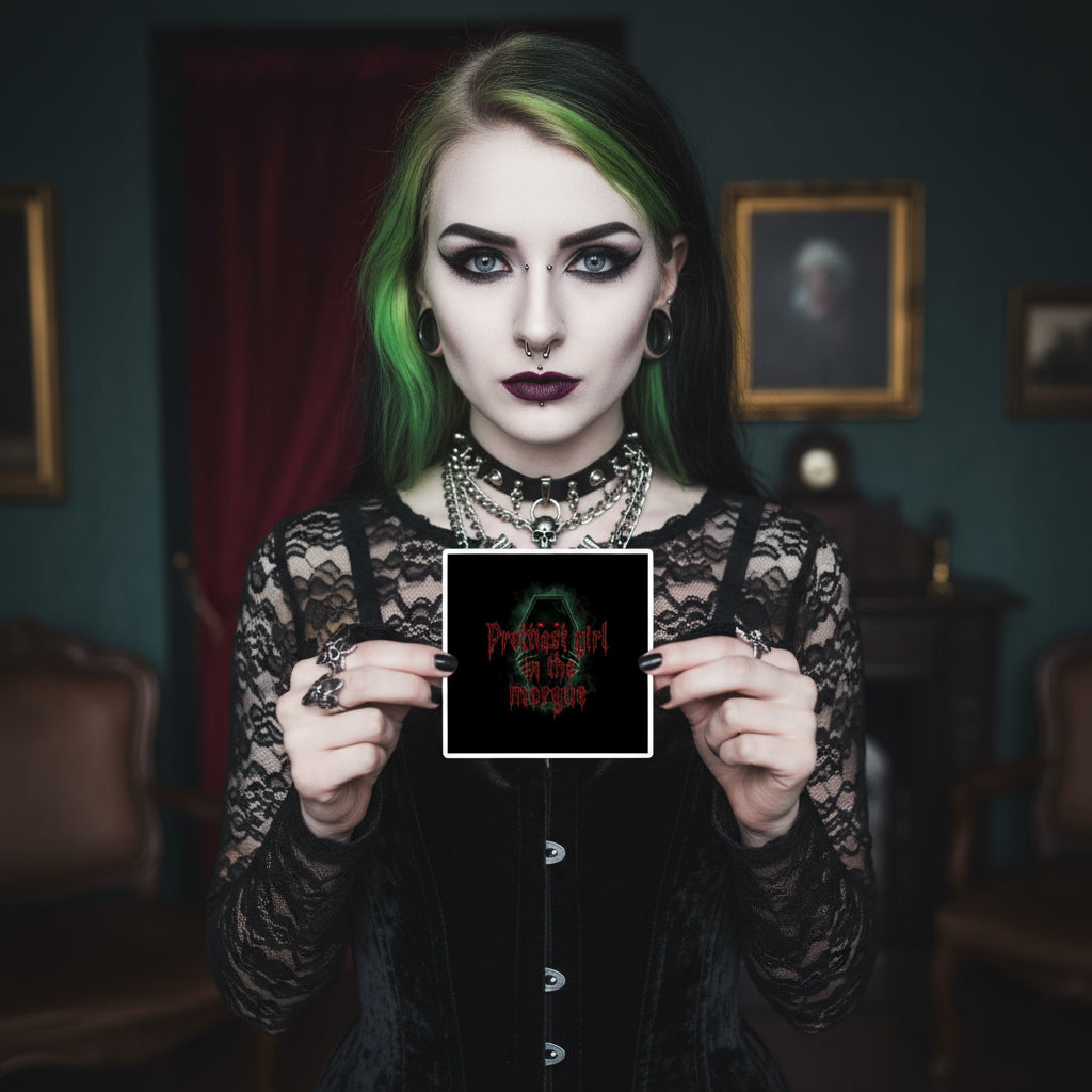 Dark, playful, and a little macabre — this magnet brings gothic attitude to any metal surface. Deep black background, smoky green aura, and dripping crimson lettering read “Prettiest girl in the morgue,” giving it a cheeky, horror-tinged charm. Slim and lightweight, it sits flush on fridges, lockers, and metal boards without overpowering your space. Choose from three sizes to add a subtle statement to your collection or to punctuate a spooky vignette during Halloween or late-night movie nights.