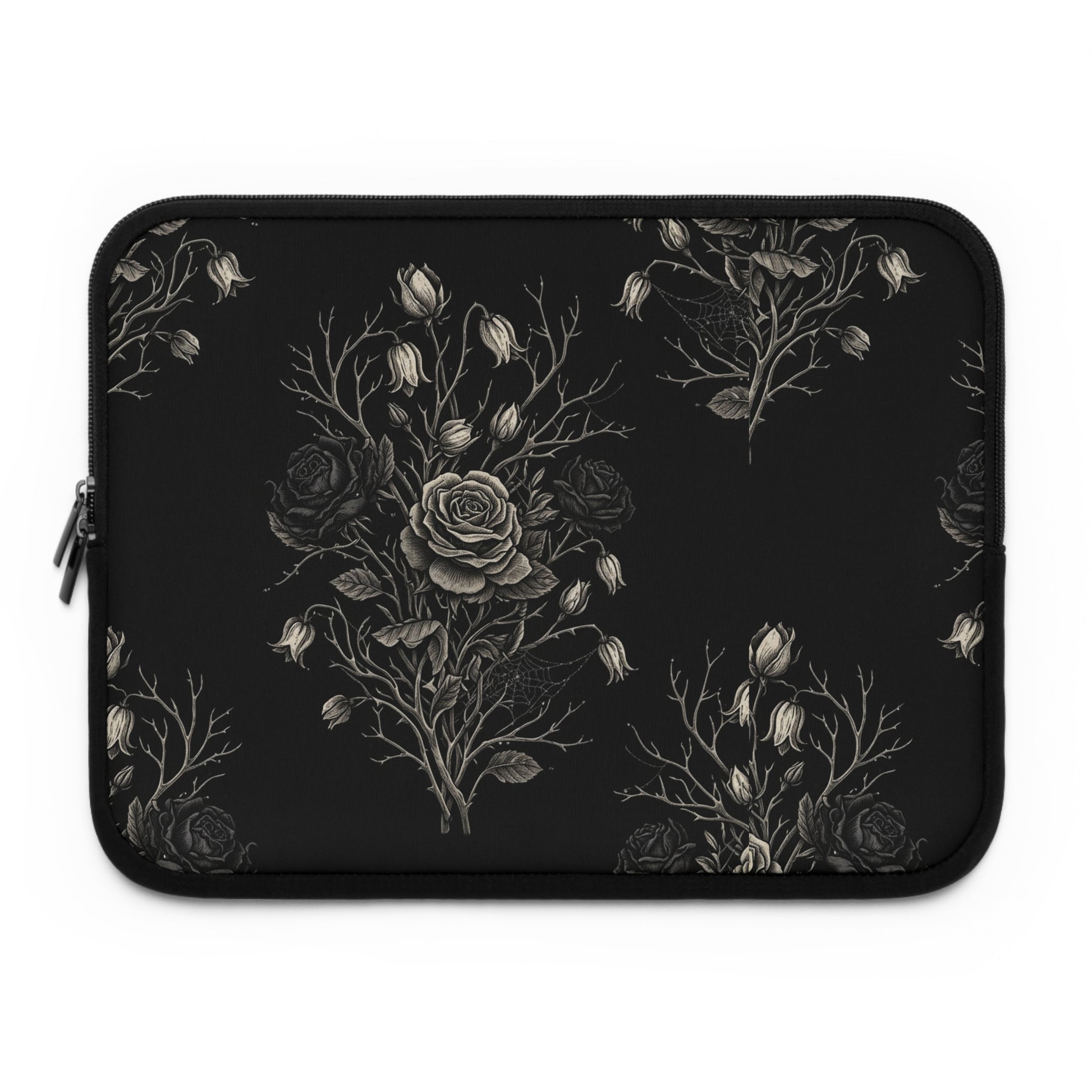 This slim laptop sleeve wraps your device in quiet elegance. A deep-black neoprene exterior holds a vintage botanical pattern — delicate roses and leafless branches rendered in muted tones — that reads subtle from across a café table and close-up becomes a little mysterious. Soft foam padding cushions against minor bumps while the water-resistant material guards against light spills and splashes. Dual zippers glide smoothly for quick access, and the solid black back keeps the look minimal and professional. Lightweight and available in multiple sizes, it slips easily into backpacks or briefcases and adds a thoughtful, artful touch to daily commute or travel.