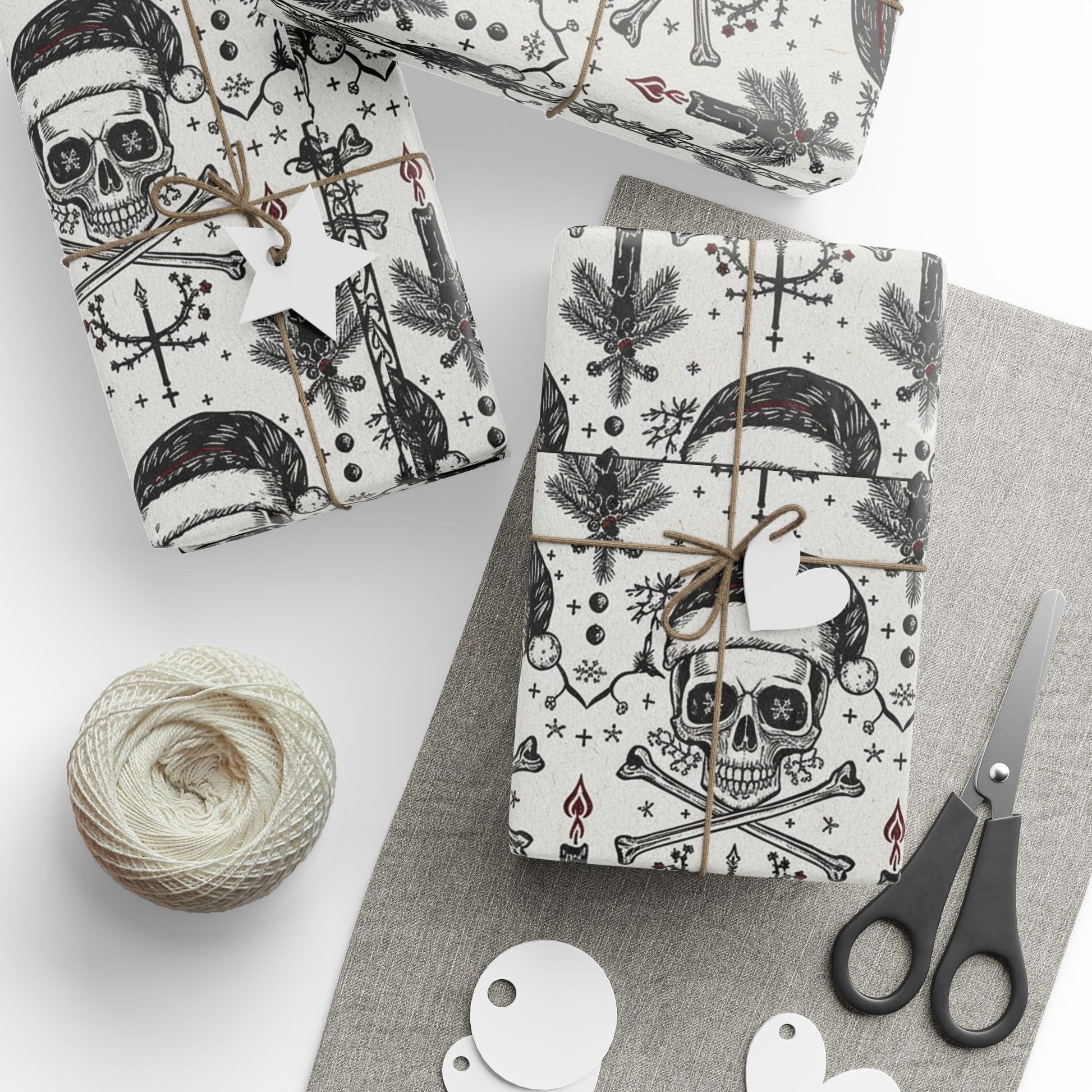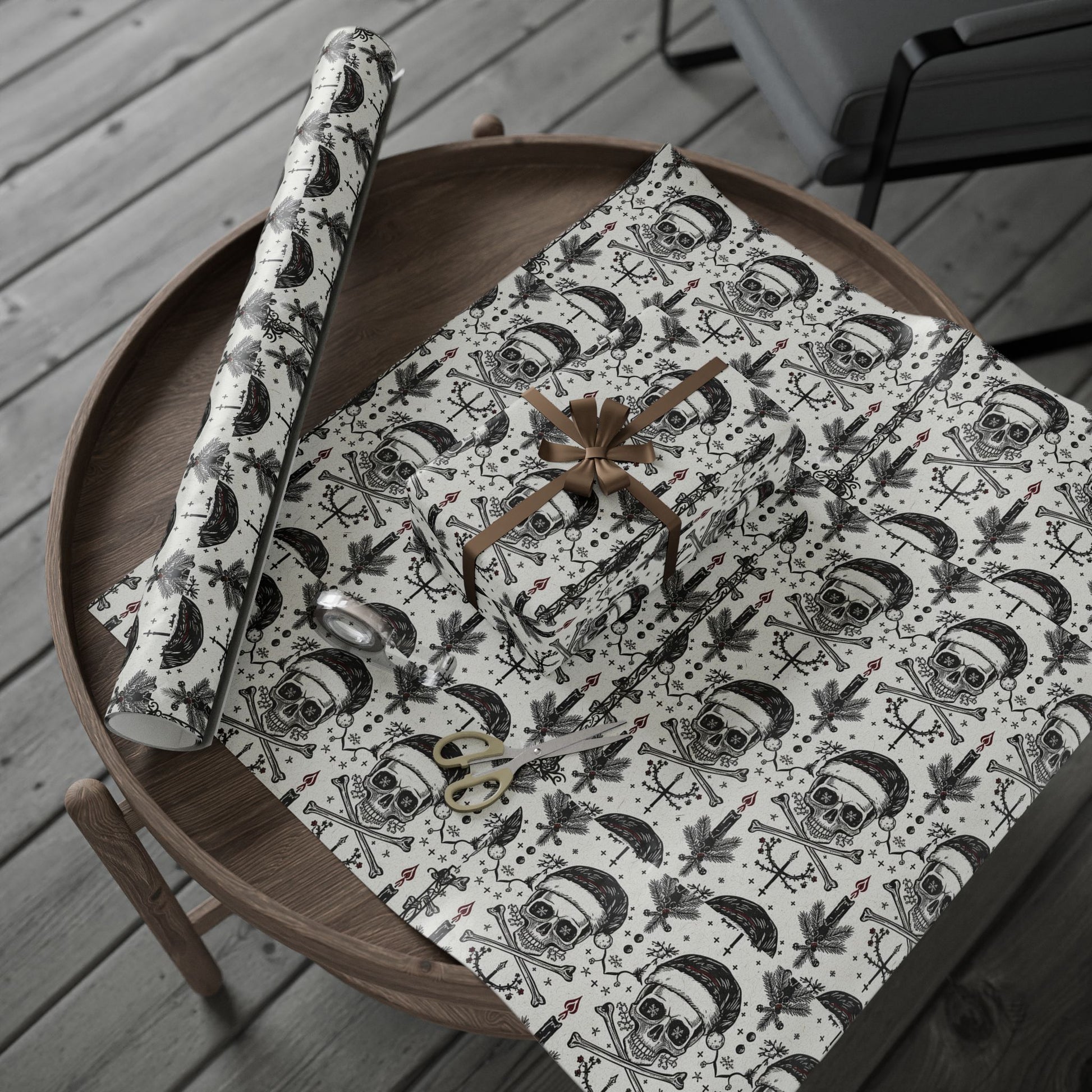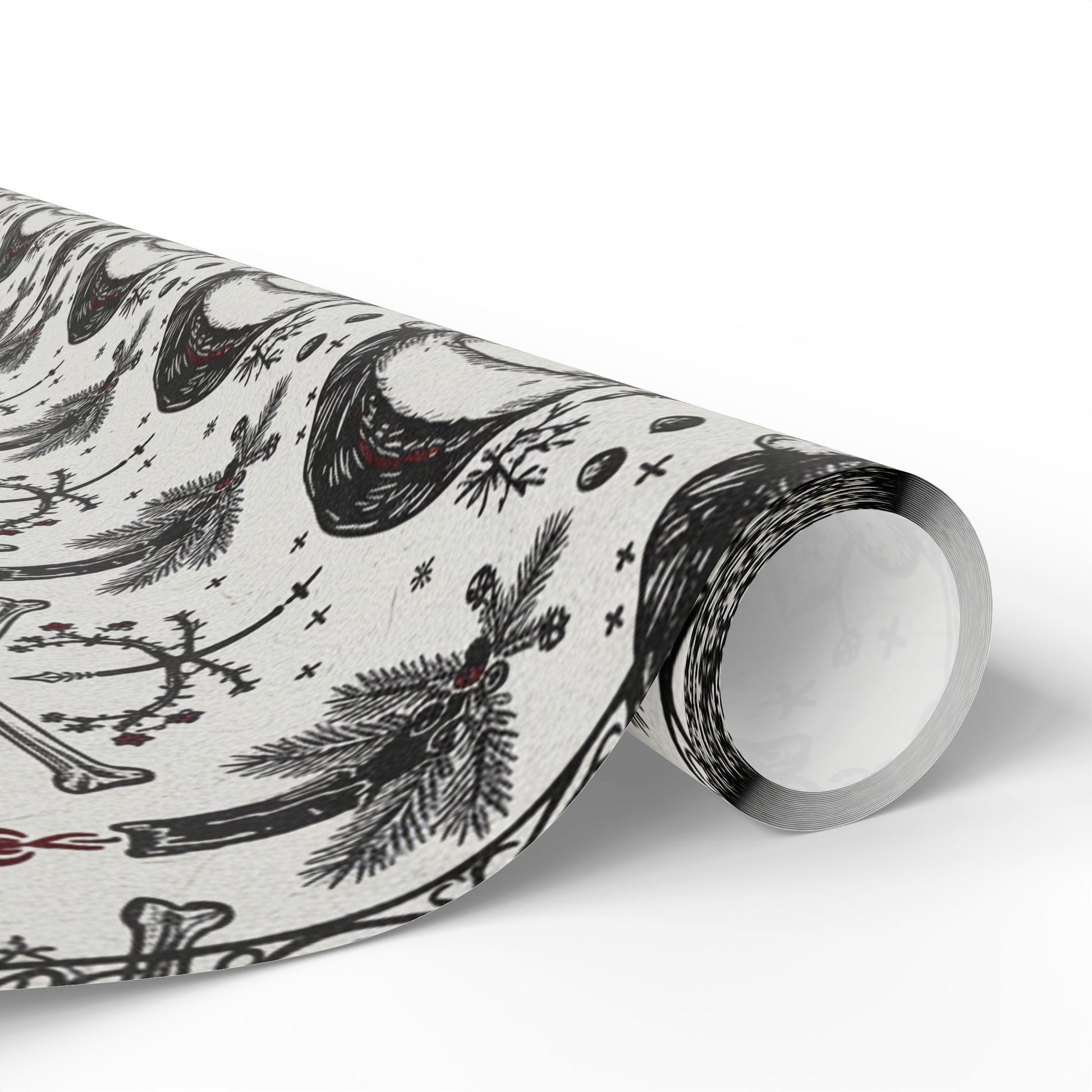 This artful wrapping paper brings a quiet, slightly eerie charm to gift-giving. Printed on 90gsm fine art paper in crisp black-and-white with small red accents, the design features hand-drawn skulls, branches, bones, and botanical elements arranged in a repeating pattern. It feels like a page torn from an old naturalist’s sketchbook — moody, detailed, and a little macabre. Use the long, narrow or full rolls to wrap confections, small boxes, or to line drawers and craft projects. The finish choice—glossy for a richer contrast or matte for a soft, vintage look—lets you match the mood. Note: prints are one-sided and rolls include small white margins with a barcode/QR at the edge.