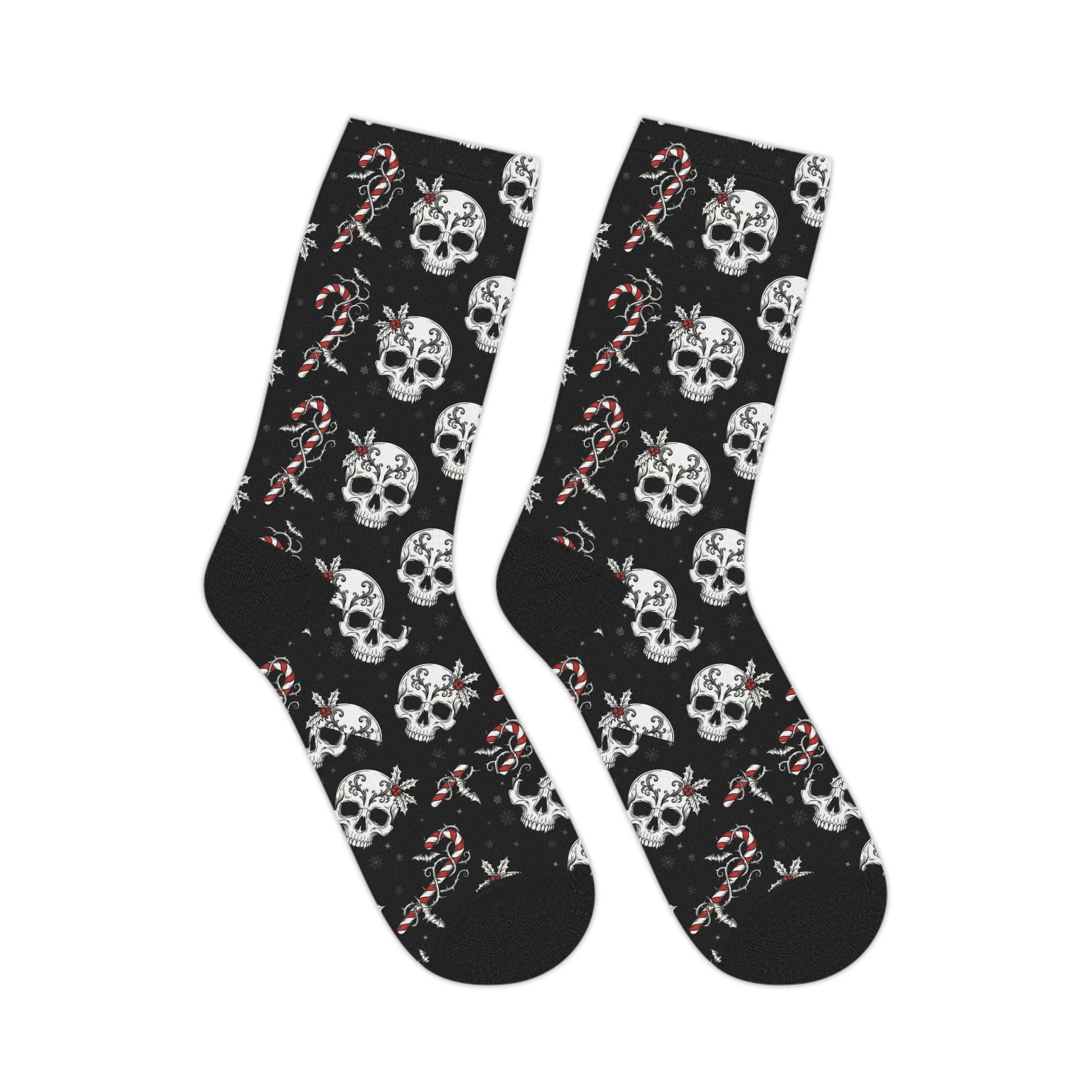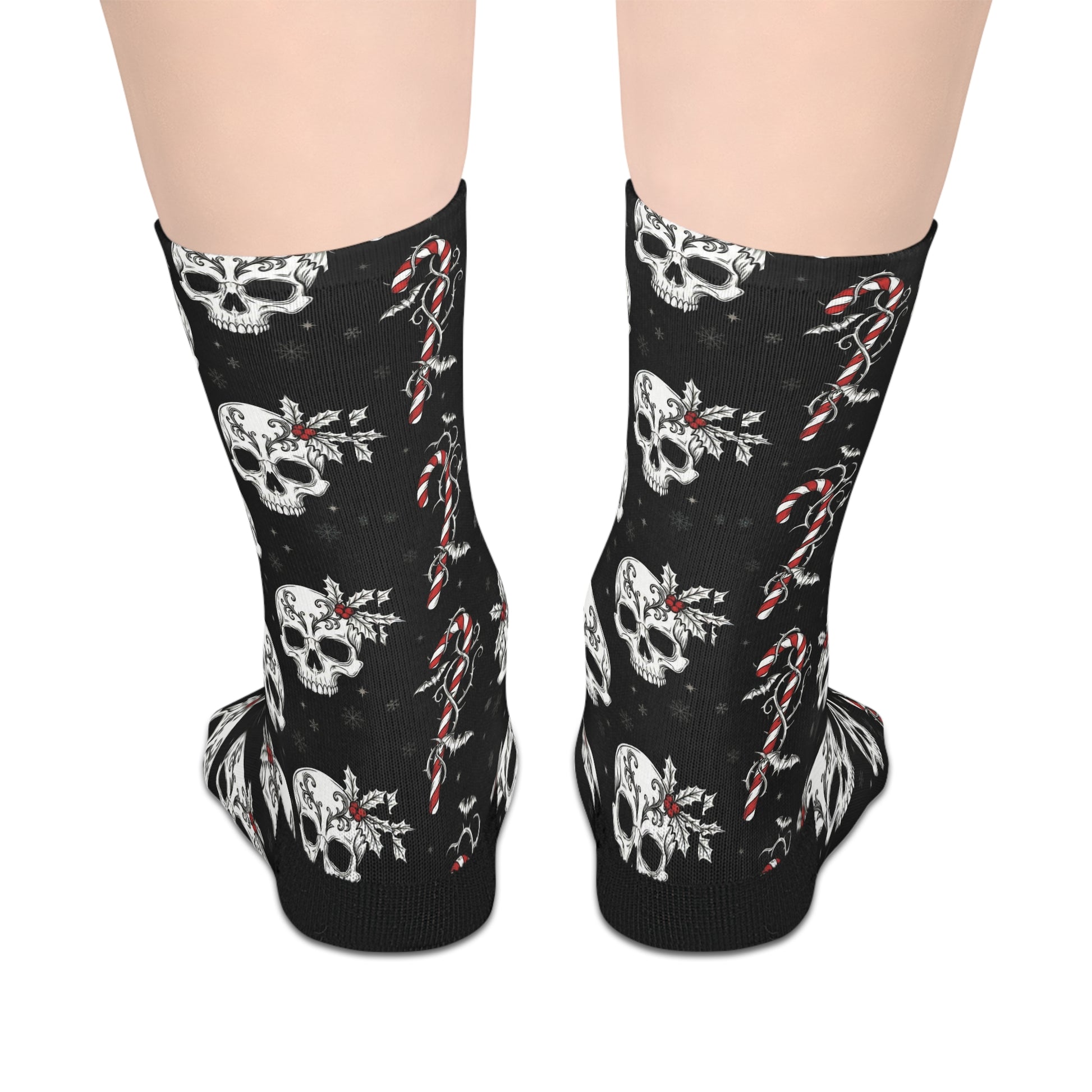 These mid-length socks bring dark whimsy to everyday wear. On a deep black background, hand-drawn skulls bloom with tiny holly sprigs while candy-cane stripes weave between them — a blend of gothic and seasonal playfulness. Lightweight and soft to the touch, they slip into boots or peek out from sneakers, adding a subtle edge to winter outfits or holiday looks. Wear them with cropped jeans, layered skirts, or under thermal leggings to give cold-weather outfits a sly, spirited twist. They’re for people who like their seasonal cheer with a shadowed grin.