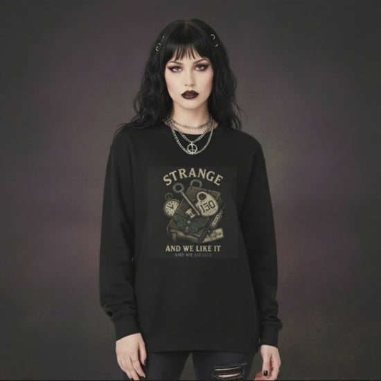 This soft, midweight crewneck brings a quiet, slightly weird charm to everyday wear. The fleece-lined interior and tidy ribbed collar hug you without bulk, while the tubular knit and tag-free neck keep the silhouette clean. The dark, vintage-style graphic reads like a private joke — strange, playful, a little occult — and settles naturally on the chest. Wear it on slow mornings, at late-night meetups, or when you want to feel cozy and a little defiantly different.